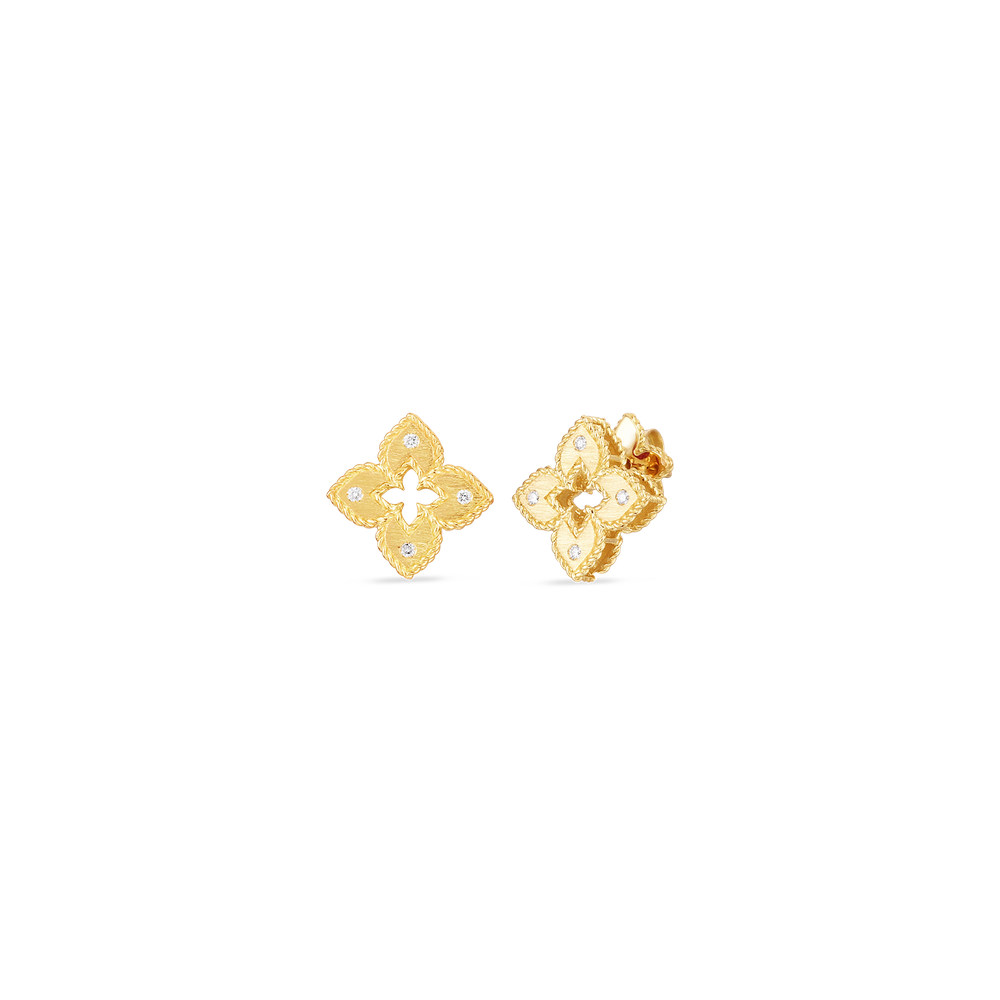 18K Yellow Gold Petite Venetian Princess Diamond & Satin Finish Small Flower Stud Earrings